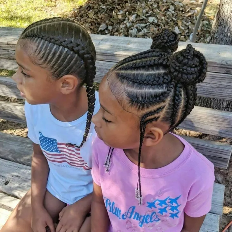 Ce look apporte un joli contraste entre le contrôle et la liberté, parfait pour les enfants à l’énergie débordante. Pour le réaliser, commencez par séparer quelques mèches sur le devant de la tête et réalisez des tresses africaines plaquées vers l’arrière. Vous pouvez en faire deux ou trois, selon la densité des cheveux.